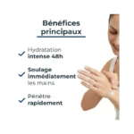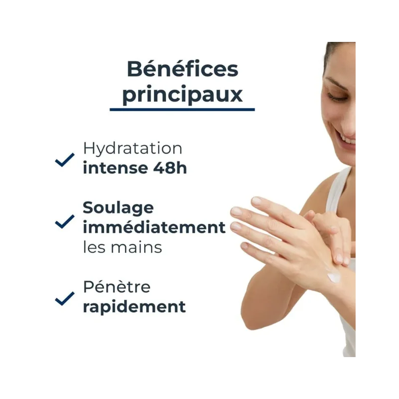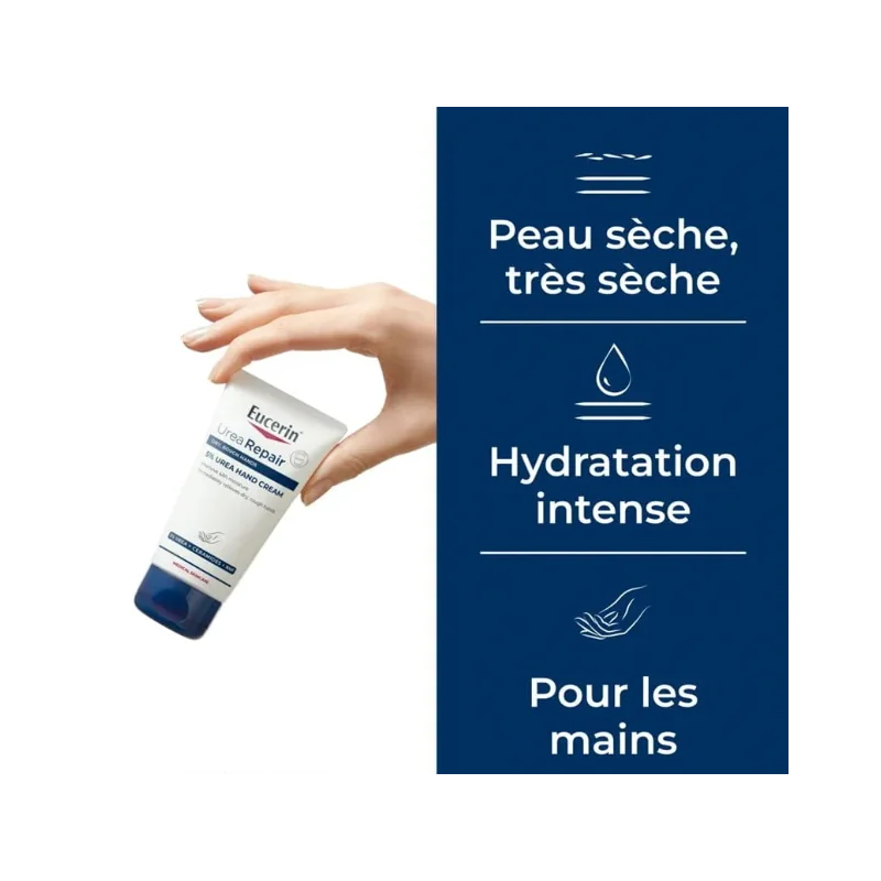 Prenez soin de vos mains au quotidien et préservez-les de la sécheresse en appliquant régulièrement Eucerin UreaRepair PLUS Crème Mains 5% d'Urée.Une crème mains réparatrice pour les peaux sèches à très sèchesLe froid, la chaleur, les changements de températures, la toxicité de l'air, agressent continuellement votre peau, notamment vos mains, plus exposées que les autres parties du corps.À force, votre protection naturelle cutanée est endommagée laissant apparaître des irritations de l'épiderme, des démangeaisons, des rougeurs ou des desquamations.Pour stopper cette sécheresse persistante et désagréable, il suffit d'adopter un geste essentiel : celui d'hydrater vos mains délicates chaque jour avec Eucerin UreaRepair PLUS Crème Mains 5% d'Urée.Cette crème mains est conçue pour apporter l'hydratation nécessaire dont vous avez besoin à long terme.En effet, ses facteurs naturels d'hydratation retiennent l'eau, contribuant ainsi au maintien d'une peau bien hydratée et apaisent même les peaux les plus rugueuses.