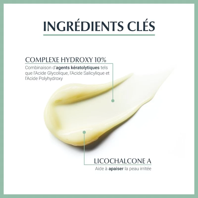Dermo Pure Soin Rénovateur Cutané agit efficacement dès la première application, et révèle une peau plus nette et plus douce jour après jour.- Le complexe Hydroxy 10% est une combinaison très efficace d'agents kératolytiques tels que l'Acide Glycolique, l'Acide Polyhydroxy. Il aide à renouveler la couche supérieure de l'épiderme, désobstrue les pores et élimine les cellules mortes.- L'Acide Salicylique réduit efficacement les imperfections et aide à prévenir leur réapparition.- La Licochalcone A (issue de la réglisse) aide à apaiser la peau irritée.