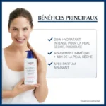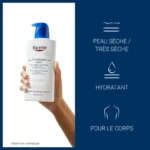 EUCERIN  UreaRepair PLUS. Emollient Réparateur, 5% d'urée. + Techonologie AquaPorin. Peaux très sèches, squameuses et irritées. Limite la perte insensible en eau . Renforce la barrière lipidique. Rétablit la synthèse naturelle d'hydratation par la peau. Pour un apaisement efficace des signes de la peau . Sans parfum – 400ml.