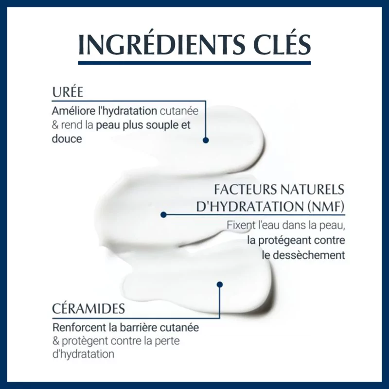 Formule INCI : Aqua, Glycerin, Urea, Cetearyl Alcohol, Glyceryl Glucoside, Cyclomethicone, Sodium Lactate, Butyrospermum Parkii Butter, Caprylic/Capric Triglyceride, Methylpropanediol, Octyldodecanol, Dicaprylyl Ether, Tapioca Starch, Glyceryl Stearate SE, Hydrogenated Coco-Glycerides, Carnitine, Céramide 3, Sodium PCA, Arginine HCL, Serine, Alanine, Histidine, Citrulline, Lysine, Lactic Acid, Sodium Chloride, Dimethiconol, Glycogen, Mannitol, Sucrose, Glutamic Acid, Threonine, Chondrus Crispus, Sodium Cetearyl Sulfate, 1,2-Hexanediol, Phenoxyethanol.