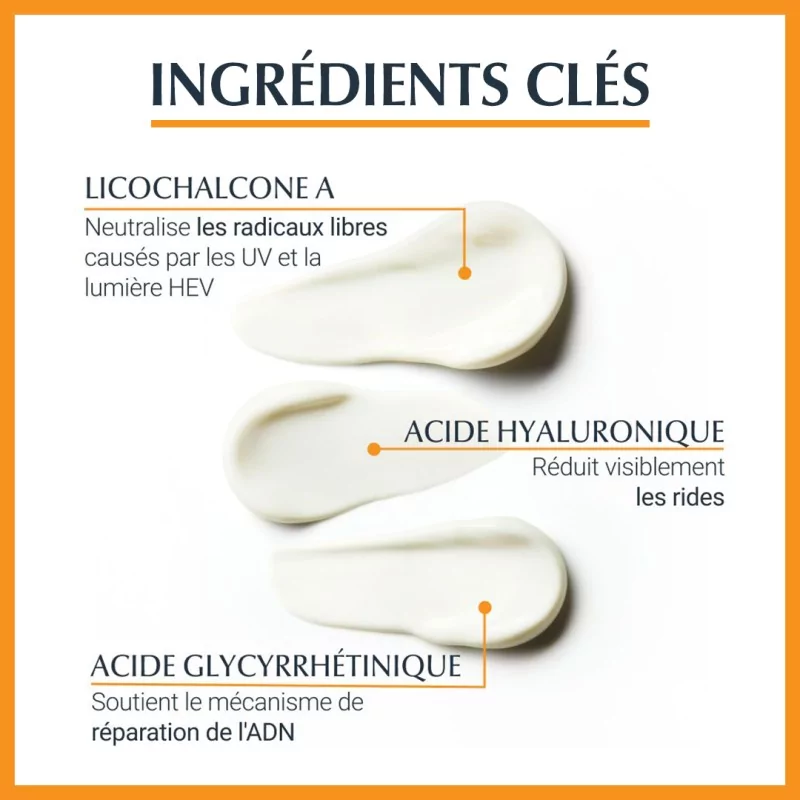 Contient l’Advanced Spectral Technology : Une combinaison de filtres UVA et UVB pour une haute protection contre les UV, associée à de la Licochalcone A un antioxydant qui agit sur lesradicaux libres générés par les UVet la lumière visible de haute énérgie.La formule contient également de l’Acide Hyaluronique de bas et de haut poids moléculaire, qui aide à réduire visiblement les rides du visage et du décolleté.