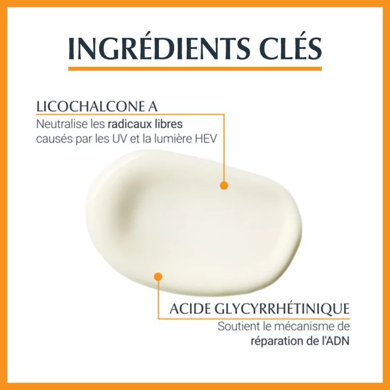Formule INCI : Aqua, Homosalate, Octocrylene, Glycerin, Dicaprylyl Carbonate, Alcohol Denat., Butyl Methoxydibenzoylmethane, Ethylhexyl Salicylate, Bis-Ethylhexyloxyphenol Methoxyphenyl Triazine, C18-36 Acid Triglyceride, Ceteareth 20, Phenylbenzimidazole Sulfonic Acid, VP/Hexadecene Copolymer, Glycyrrhiza Inflata Root Extract, Glycyrrhetinic Acid, Acrylates/C10-30 Alkyl Acrylate Crosspolymer, Ethylhexylglycerin, 1.2 Hexanediol, Phenoxyethanol.